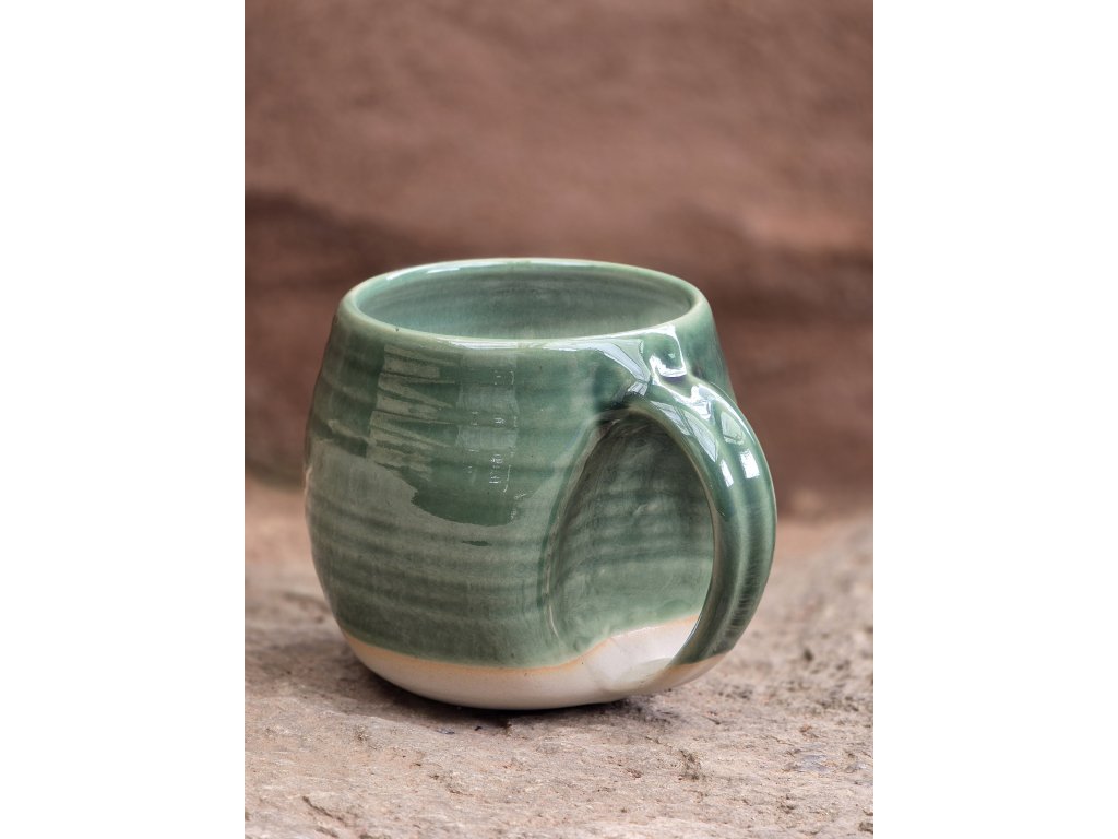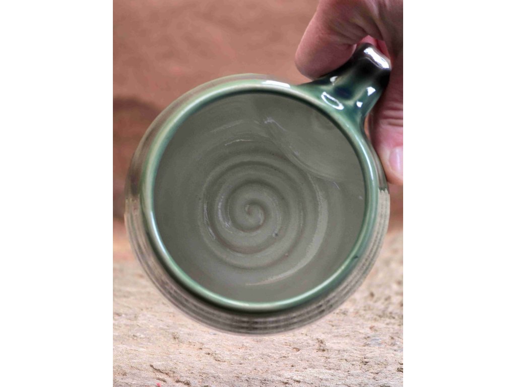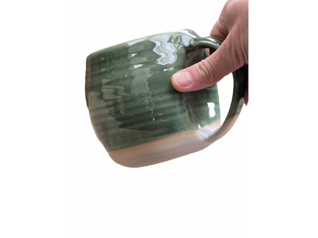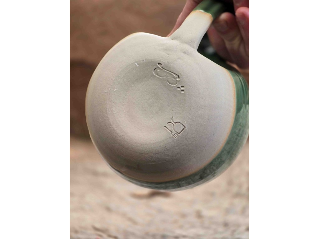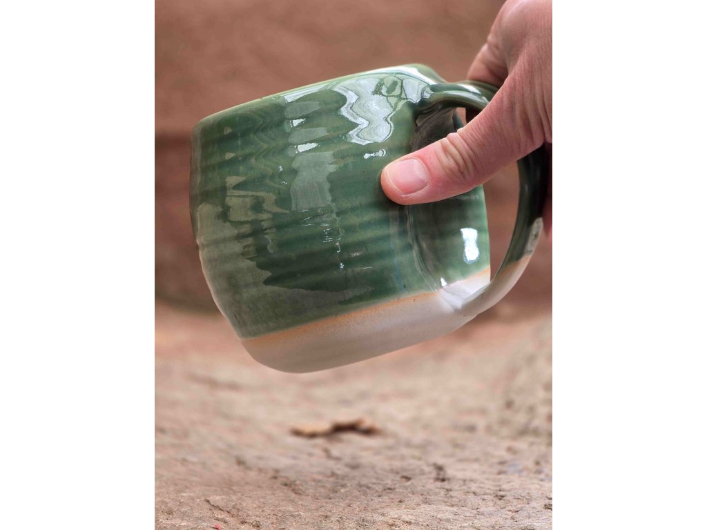 Hrnek je ručně točený ze světlé jemné kameniny a vypalovaný na poctivých 1280 °C. Zvenku je pokrytý hlubokou zelenou glazurou Oribe s vysokým leskem, uvnitř je bílá lesklá glazuru, která se snadno čistí a nechává vyniknout barvě nápoje.