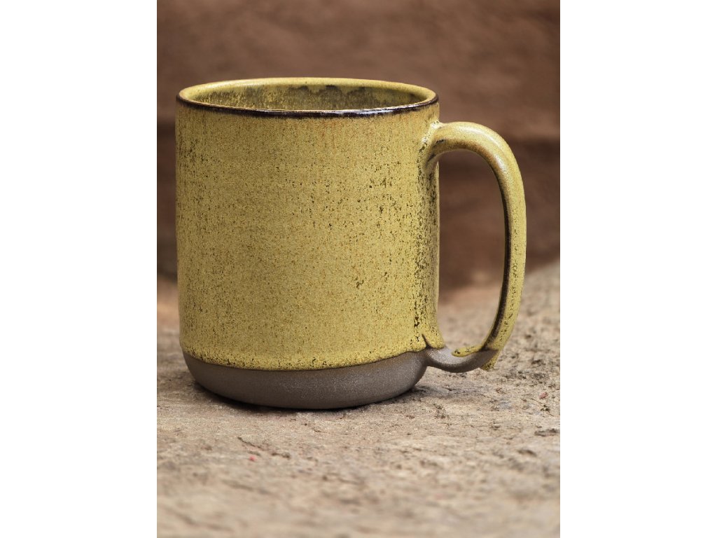Jeho glazura je sama o sobě malý svět. Golden Haze má hořčicově-zlatý odstín, který zdobí jemné mikrokrystaly rozptylující světlo, takže povrch působí jemně strukturovaně, hladký na omak a při různém úhlu dopadu světla získává subtilní hloubku. Uvnitř je čistá bílá živcová glazura — praktická, stálá a krásně kontrastní.