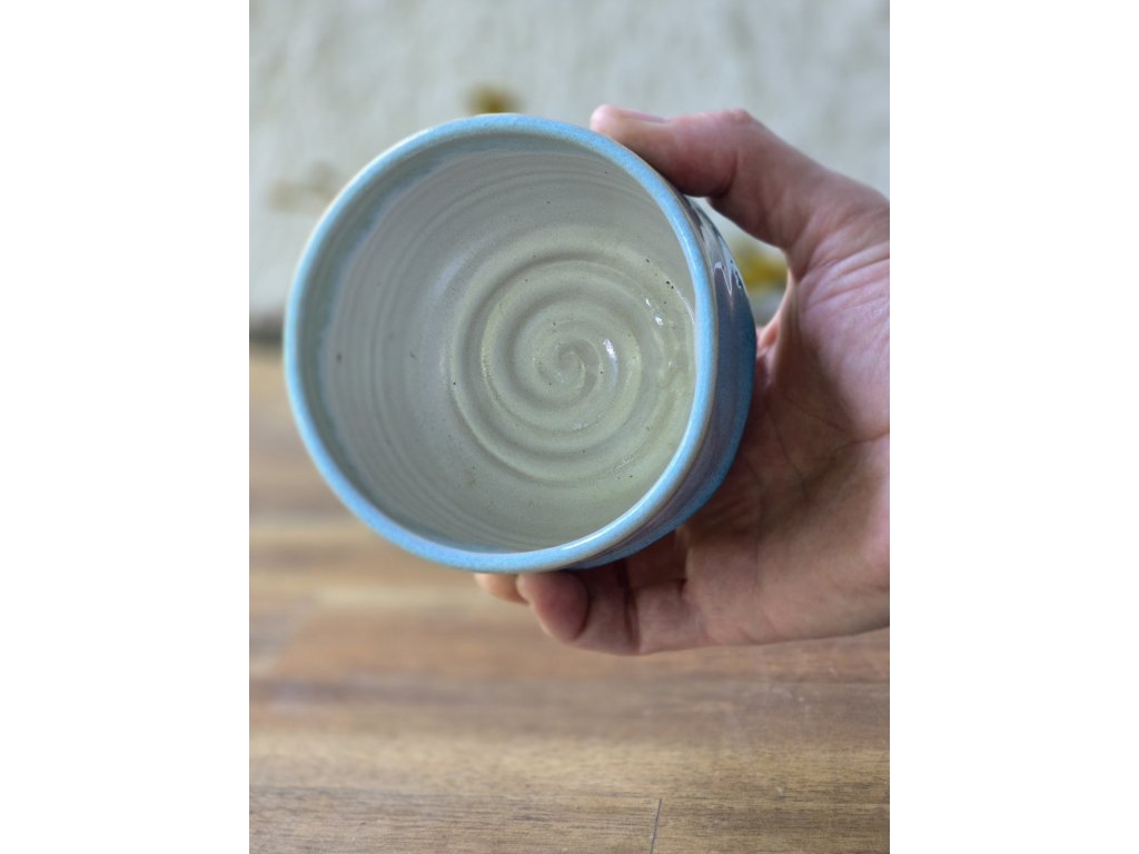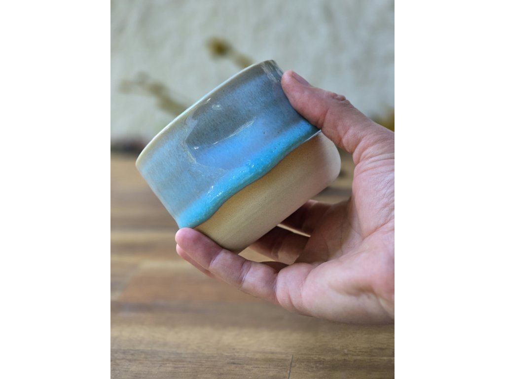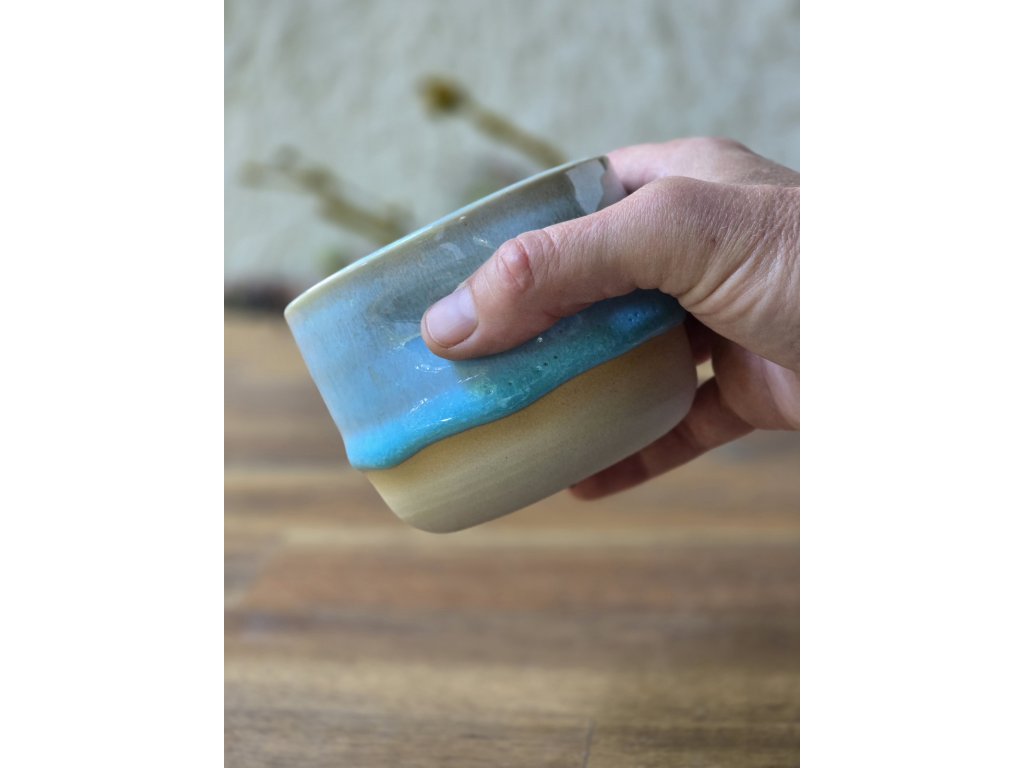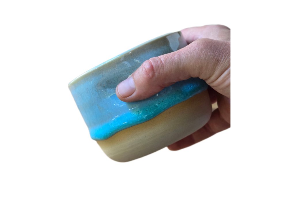Autorská reaktivní tyrkysová glazura připomíná barvu moře v karibiku. Při dopadu světla odhaluje jemné proměny tónů, které dodávají kalíšku hloubku a originalitu. Každý kus je jedinečný – výsledný vzhled se liší podle toho, jak se glazura v peci rozlije.