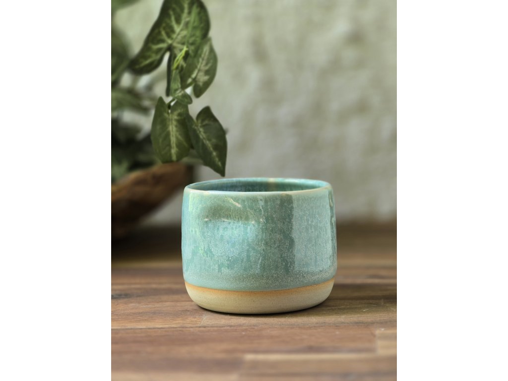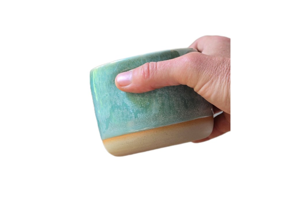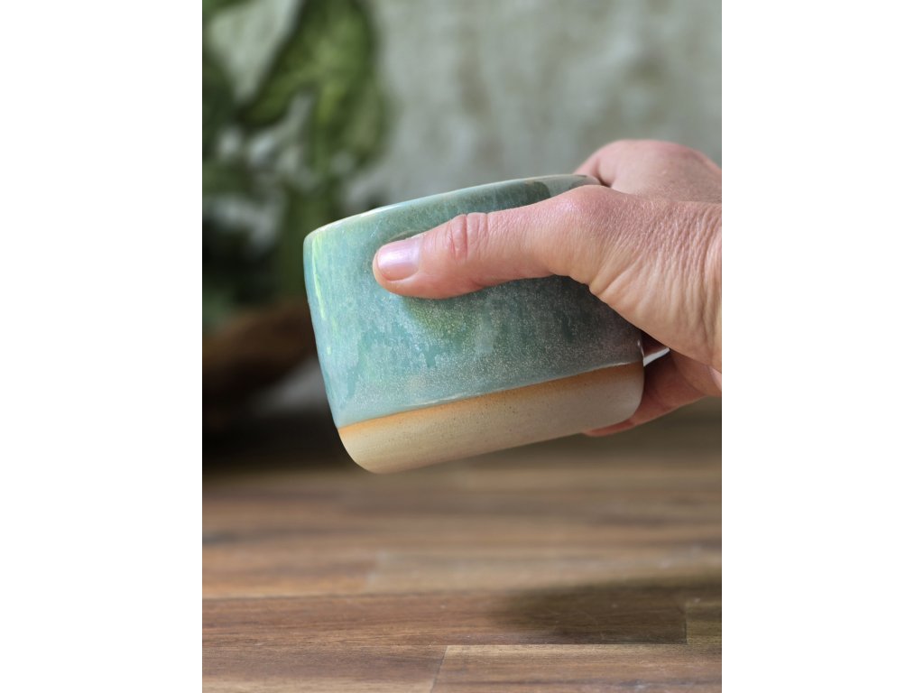 Objem 350 ml je ideální na cappuccino, čaj nebo filtrovanou kávu. Kalíšek je ručně točený z jemné kameniny, má jednoduchý, lehce zaoblený tvar a důlek na palec pro pohodlné držení. Spodní okraj je jemně broušený, neglazovaný a ponechává nádech přírodní režné hlíny, což glazuře dodává na hloubce i kontrastu.