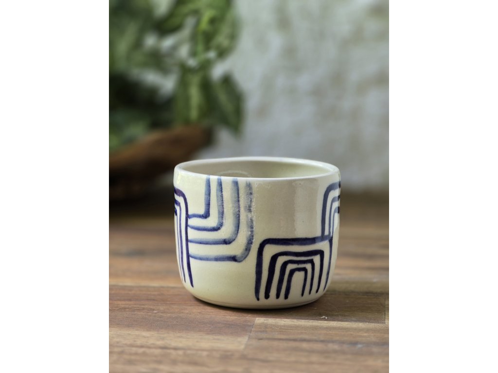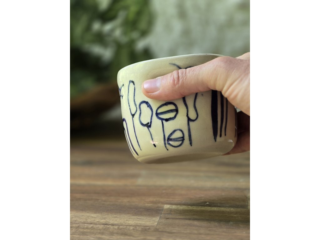 Objem 350 ml je ideální na cappuccino, větší kávu nebo čaj. Kalíšek je ručně točený z kameniny, dekorovaný podglazurní malbou, následně překrytý tvrdou živcovou glazurou. Uvnitř je drobná malbička – jen pár teček nebo čar, které nenápadně doplňují celkovou kompozici.