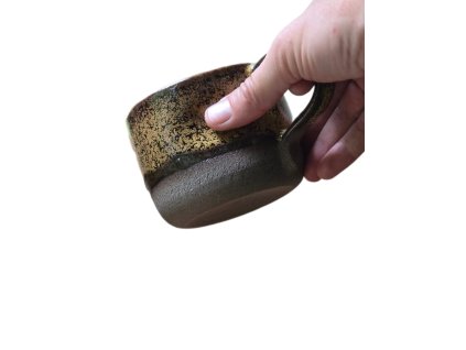 Cappuccino hrnek Golden Haze s ouškem a důlkem na palec. 350 ml, mikrokrystalická glazura se zlatavými tóny na tmavé kamenině, vhodný do myčky i mikrovlnky.