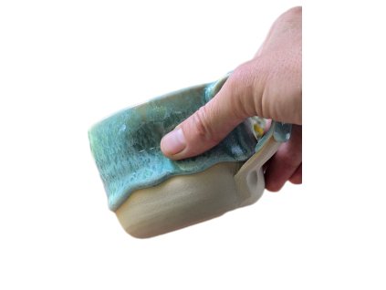 Cappuccino hrnek Maledivy s ouškem a důlkem na palec. 350 ml, glazura v tyrkysových a stříbřitě zelených tónech, ručně vyrobený, vhodný do myčky.