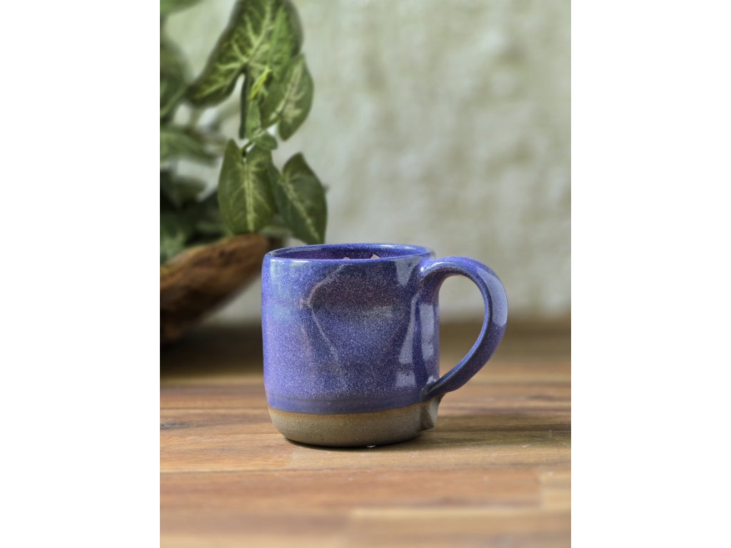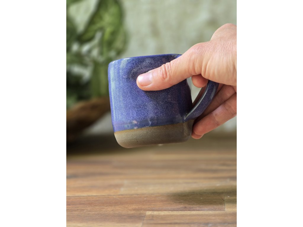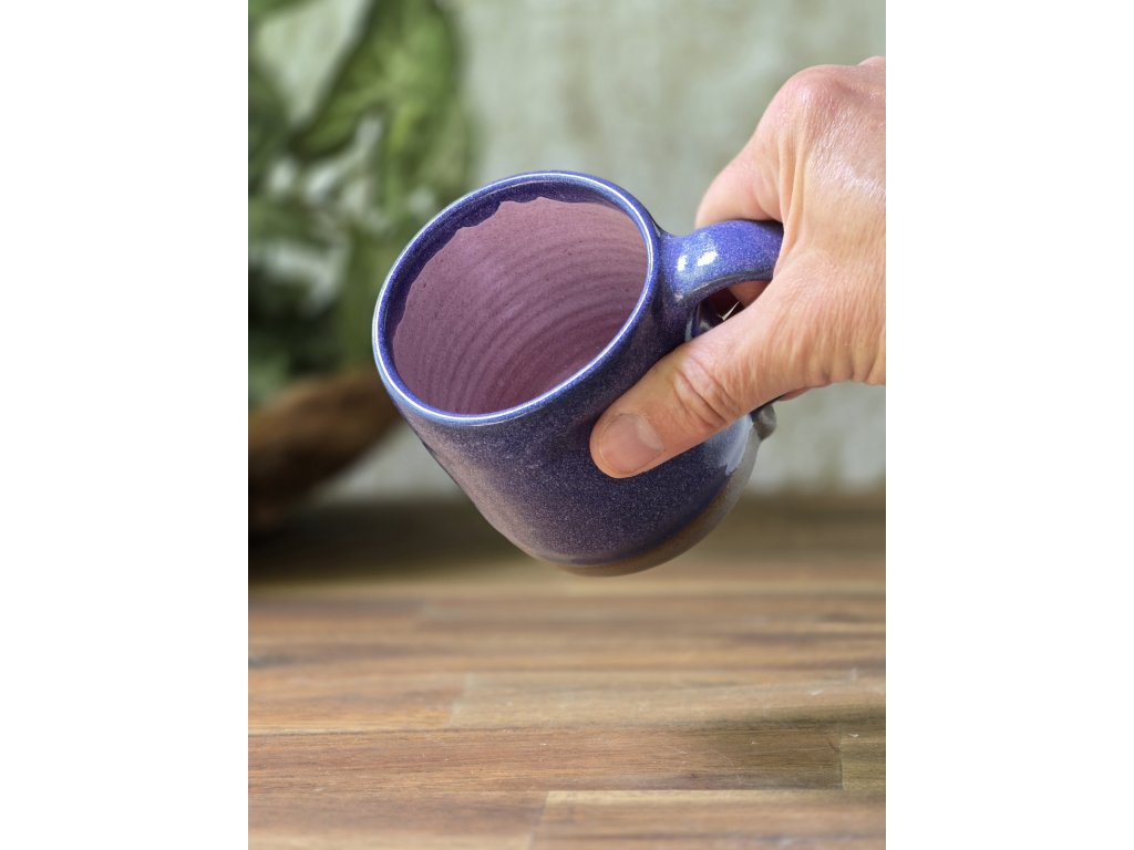 Mikrokrystalická glazura Nebula reaguje na tloušťku vrstvy – v tenčí části má modrý nádech, v silnější vystupují jemné fialové krystalky. Vnitřek hrnku je glazovaný jemně růžovou glazurou Sakura, která přidává hravý kontrast a dává vyniknout nápoji. Každý kus je trochu jiný, ale právě to z něj dělá originál.