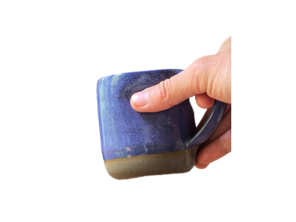 Důlek na palec je navázaný přímo na ouško – můžete držet za ouško, a přitom si pohodlně opřít palec. Tvarově je hrnek rovný, dole zaoblený a hlazený pro příjemný dotek i snadné mytí.