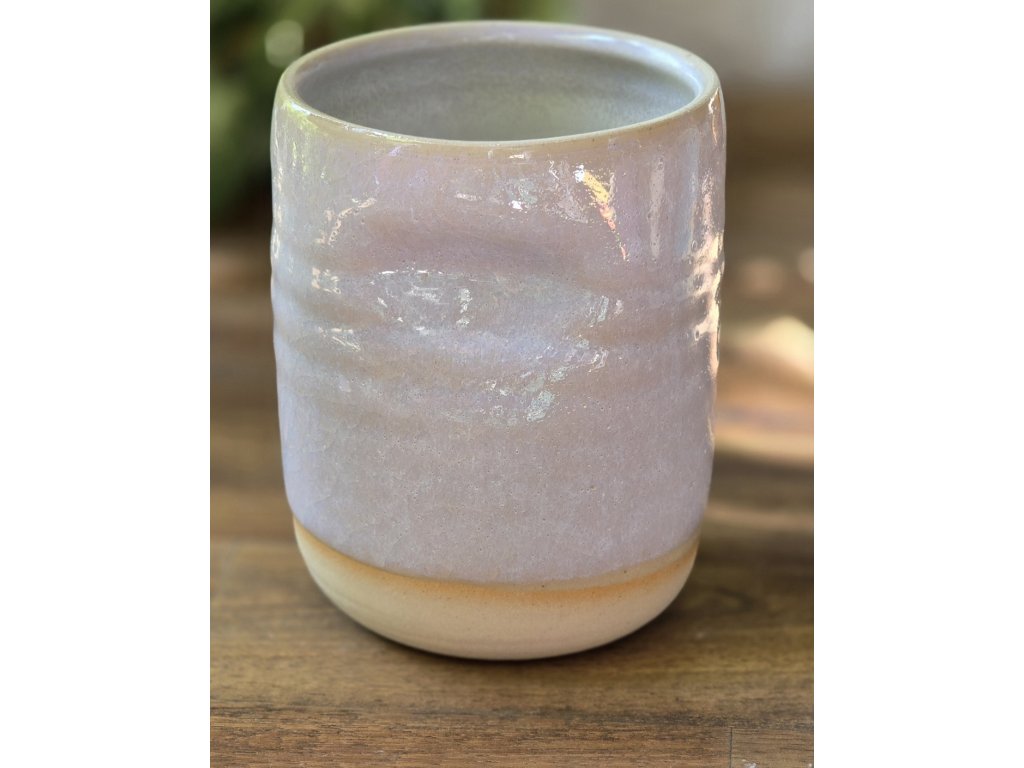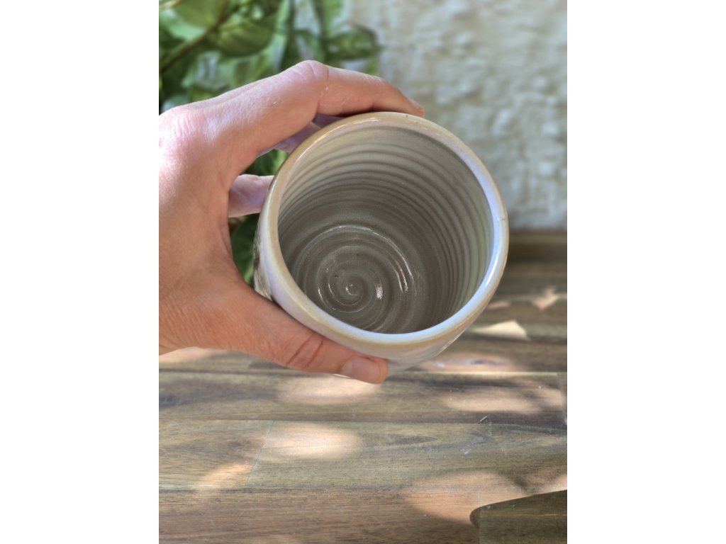 Glazura Moon Stone v mléčně bílé barvě vytváří jemný, přírodní dojem. Kalíšek je točený ze světlé kameninové hlíny, přičemž tvar pohodlně padne do ruky díky prohlubni na palec.