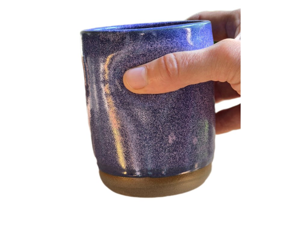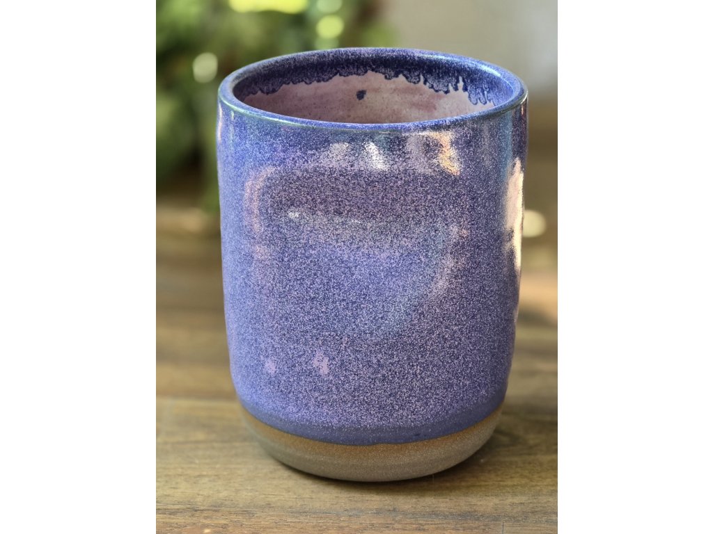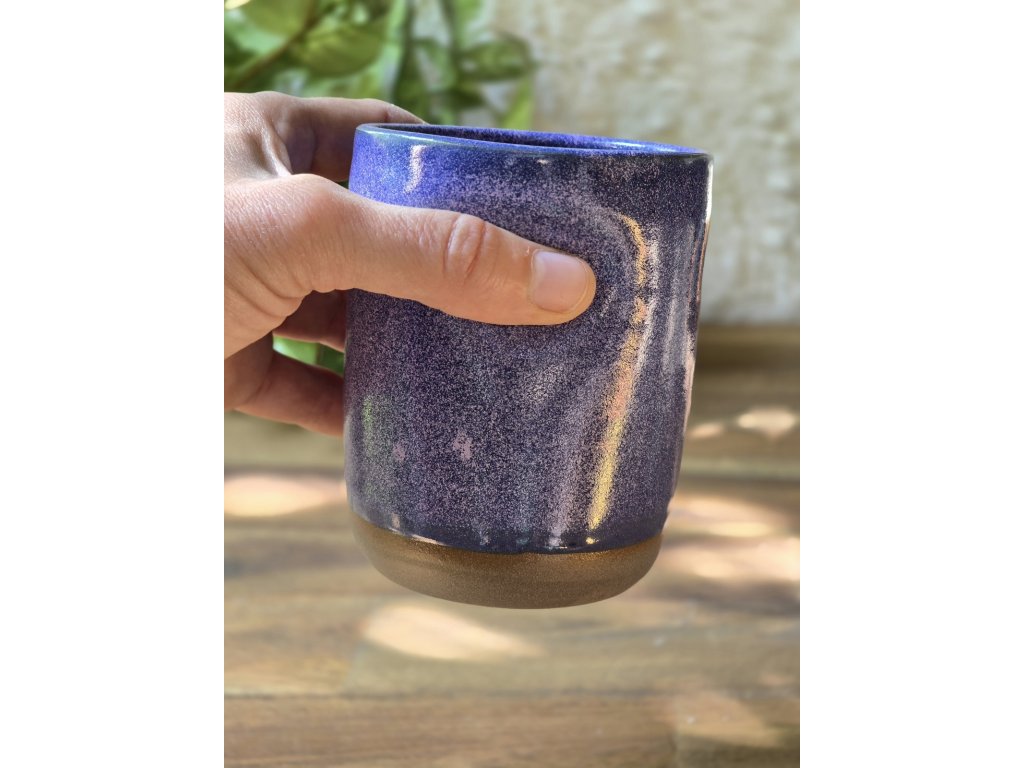 Latte kalíšek Nebula z tmavé kameniny připomíná noční oblohu plnou hvězd. Jeho povrch přechází od temně fialových tónů do modrofialových a růžových odlesků, které se mění podle světla. Vnitřní růžová glazura dodává jemný kontrast a teplo – jako světlo hvězd v hlubině vesmíru.
