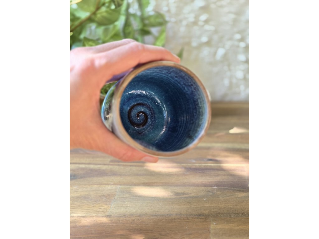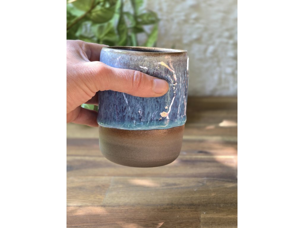Tento ručně vyrobený kalíšek bez ouška o objemu 400 ml si zamilovali zákazníci pro jeho příjemný tvar, pohodlné držení i fascinující glazuru SeaFoam. S důlkem na palec skvěle padne do ruky – ideální na latte, chai, kakao i studené limonády.