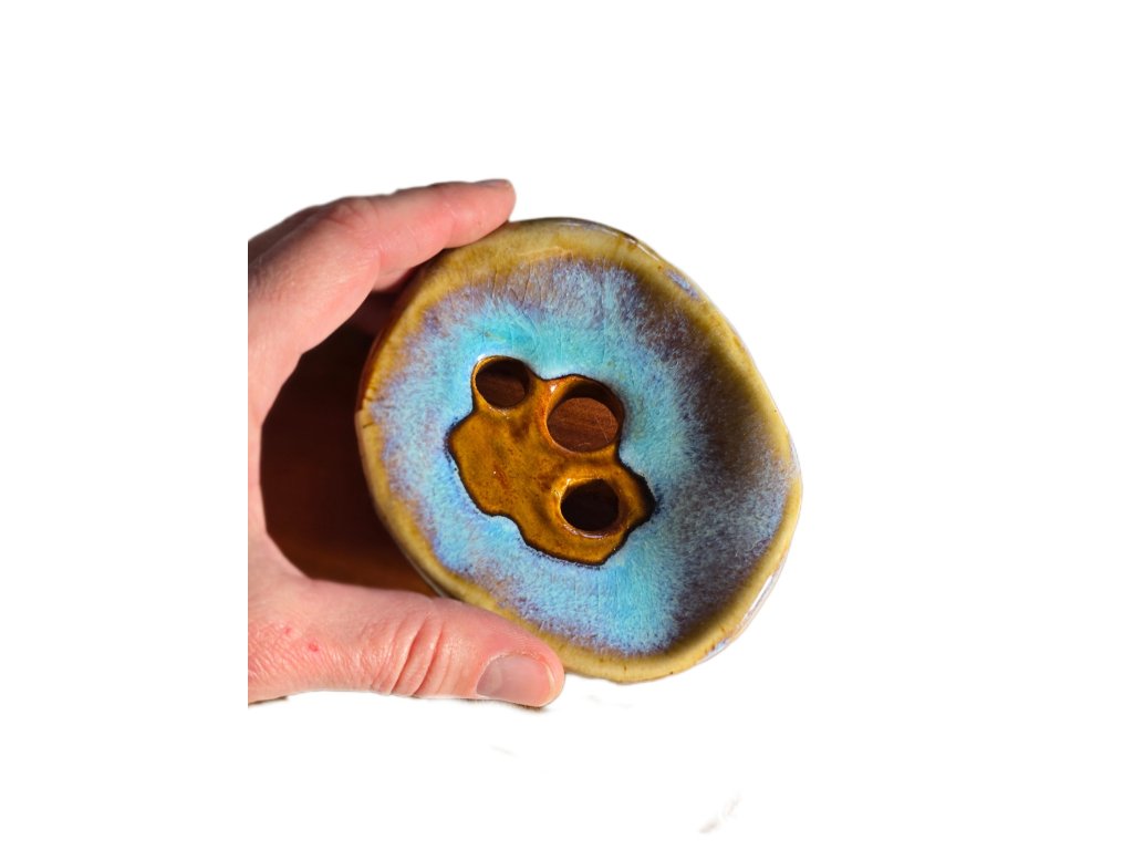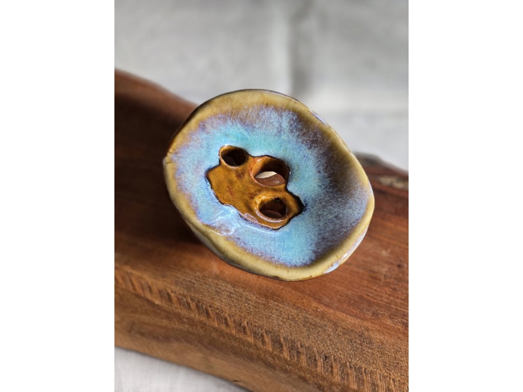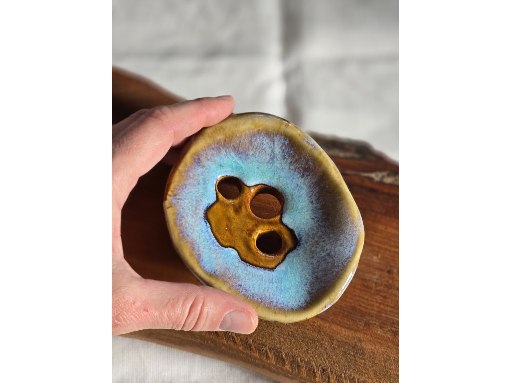 Mýdlenka IceFall z kameniny s reaktivní glazurou IceFall a třemi odtokovými otvory. Zajišťuje rychlé osychání mýdla, je vypálená na vysokou teplotu a vhodná do myčky.