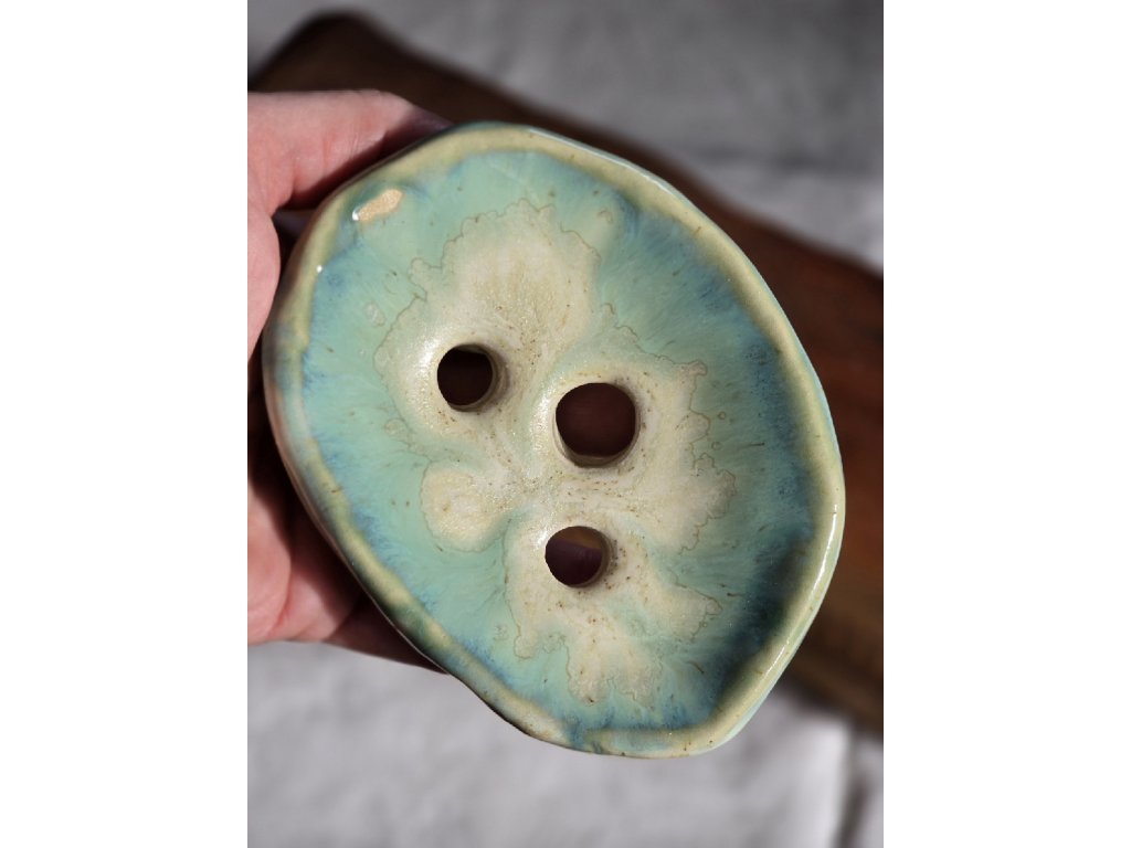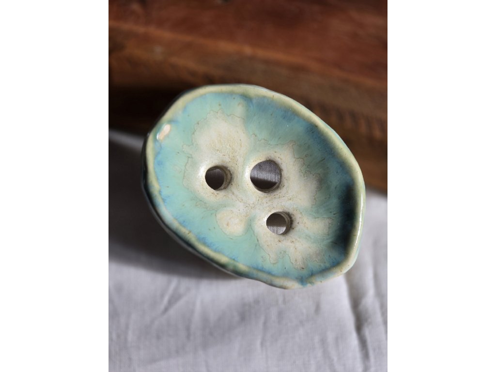 Mýdlenka Icelandic z kameniny s kombinací glazury Oribe a nové krystalické glazury. Tři odtokové otvory umožňují rychlé osychání mýdla. Vypáleno na 1230 °C, vhodná do myčky nádobí.
