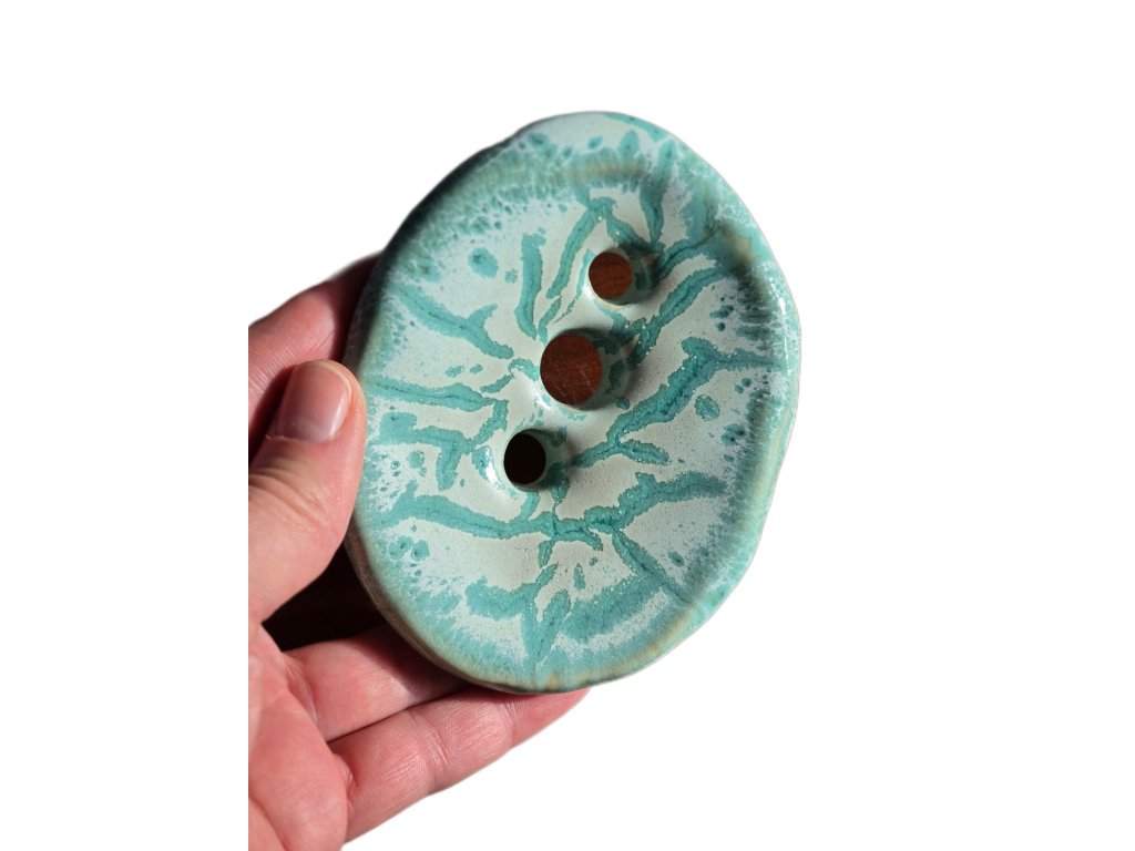 Mýdlenka Maledivy z kameniny s tyrkysovou reaktivní glazurou. Tři odtokové otvory udrží mýdlo v suchu. Vypálená na vysokou teplotu, vhodná do myčky.