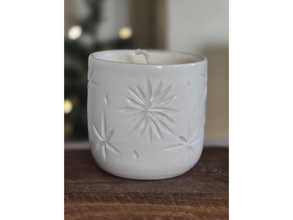 Porcelánový yunomi kalíšek se sójovou svíčkou a hvězdami z limitované vánoční edice. Ručně vyráběný kalíšek s proskrabávanými hvězdami, které při hoření svíčky jemně prosvítají porcelánem. Po vyhoření lze kalíšek běžně používat.