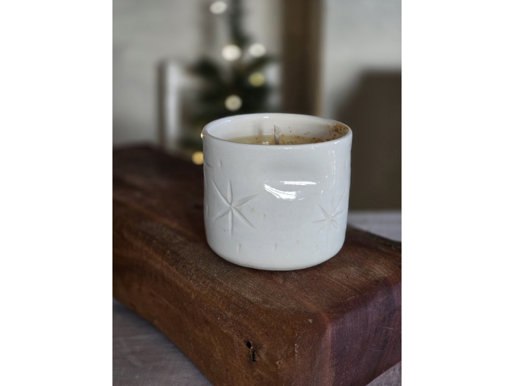 Porcelánová svíčka s prosvítajícími hvězdami Kořeněný pomeranč je vánoční limitka ze sójového vosku v porcelánovém yunomi kalíšku. Při hoření jemně prosvítají vyškrabávané hvězdy a po dohoření zůstává kalíšek plně použitelný.