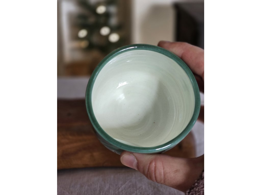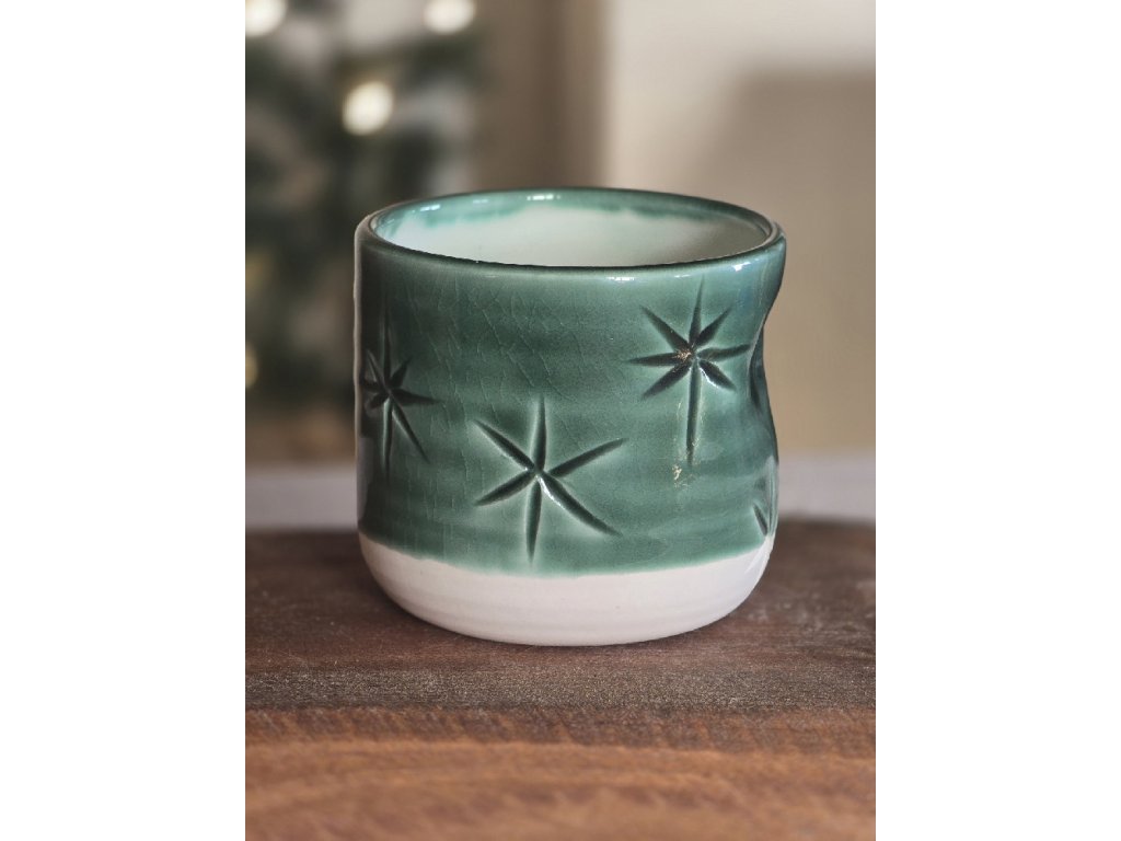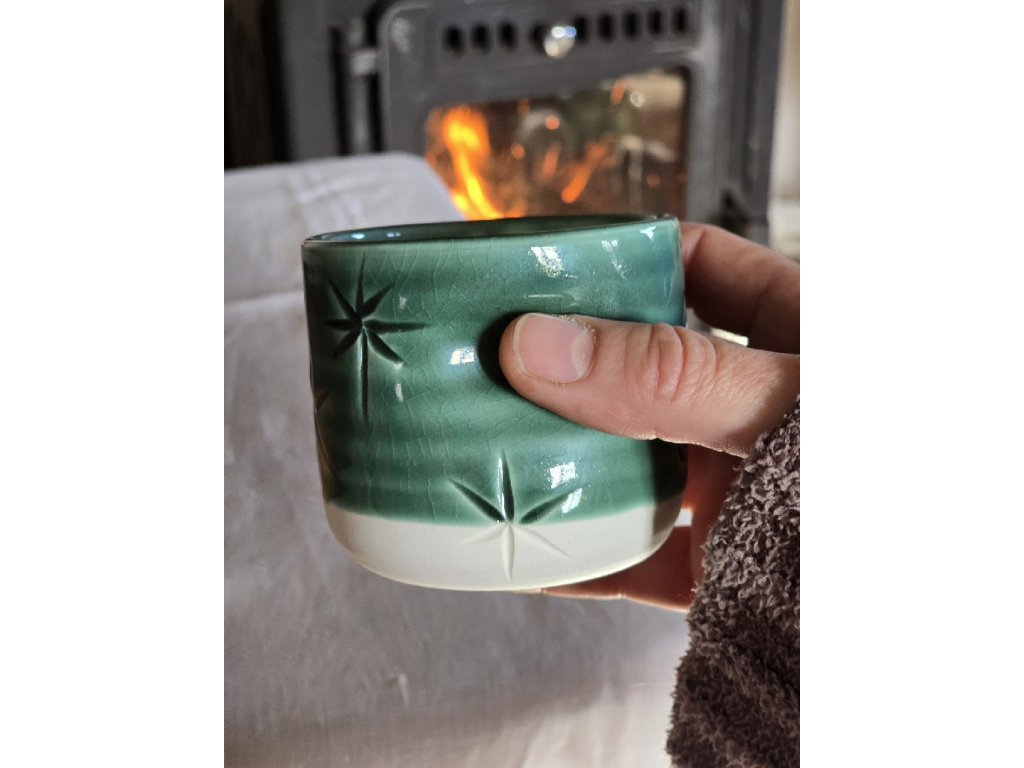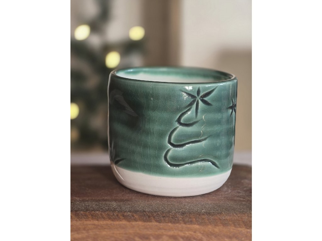 Tenhle kalíšek vznikl jako tichý experiment těsně před Vánoci. Porcelán, zelená glazura Oribe a jemně prořezávaný motiv stromečku a hvězd, které krásně prokreslují skrz tenkou stěnu materiálu.