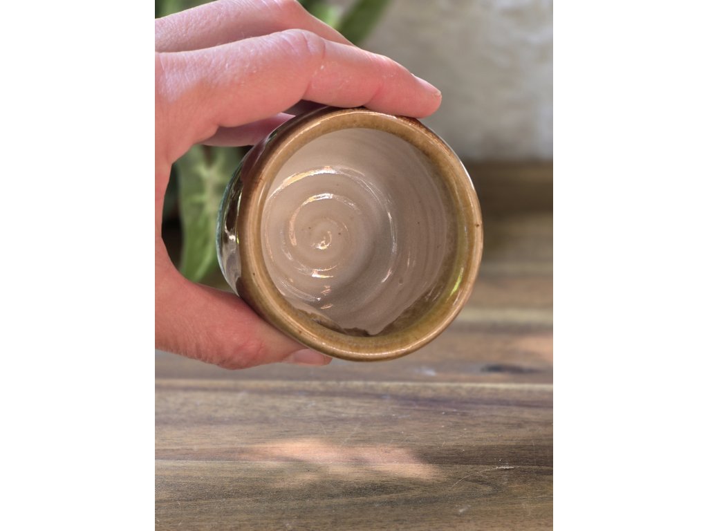 Ručně točený z kameniny, s důlkem na palec, padne skvěle do ruky a dobře se drží i při ranním spěchu. Tvar je kompaktní, stabilní a spodní část je zaoblená a hlazená, aby nepoškrábala stůl a byla příjemná i na dotek.
