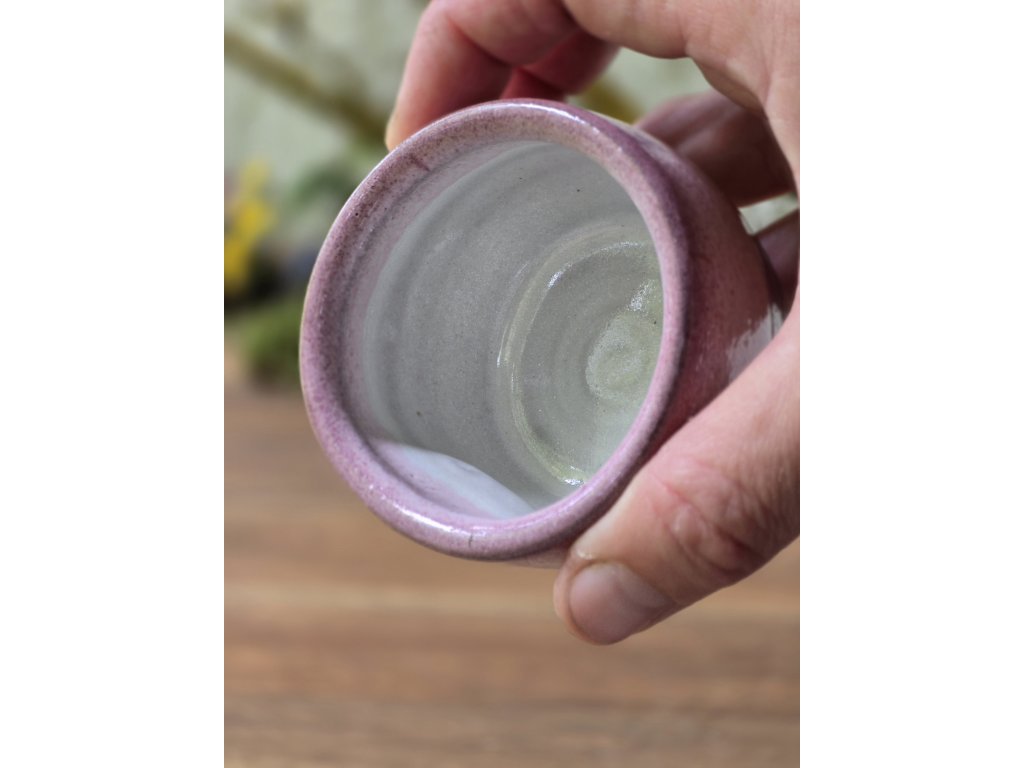 Presso šálek Sakura s důlkem na palec. 80 ml, jemně růžová glazura inspirovaná květy sakury, ručně vyrobený z kameniny, vhodný do myčky.