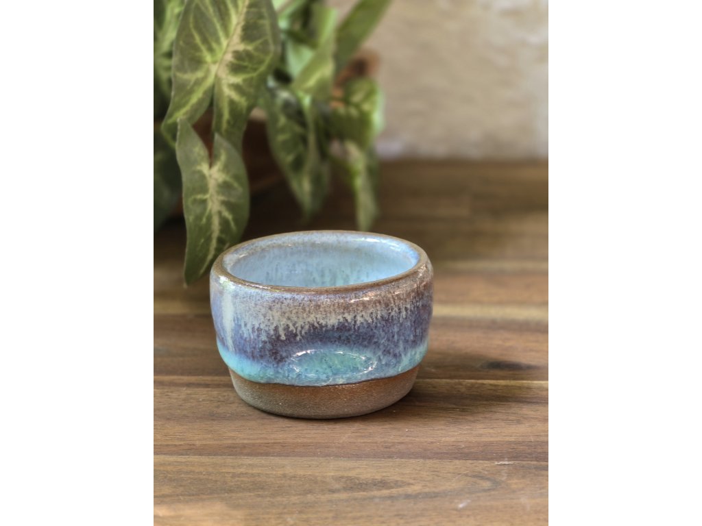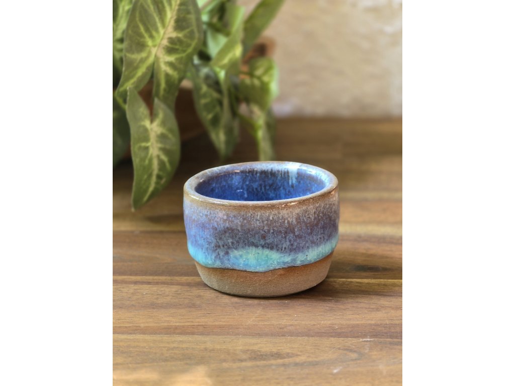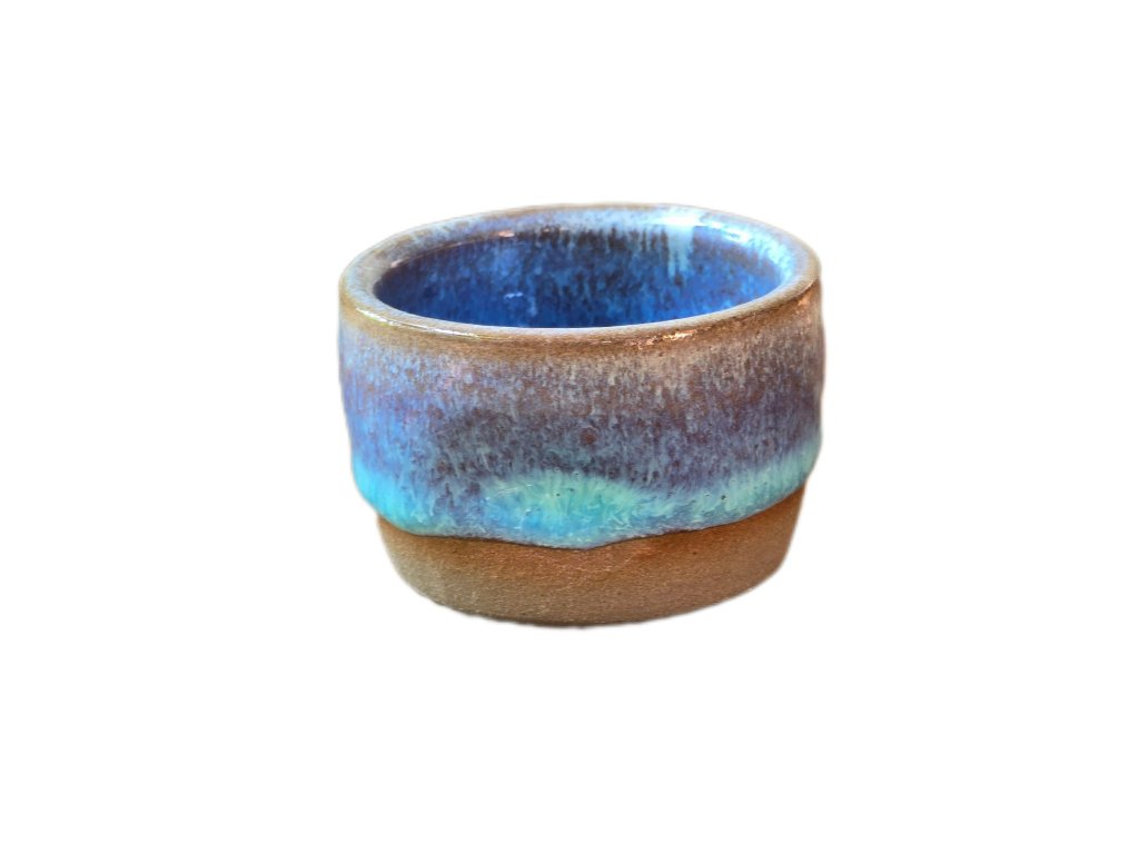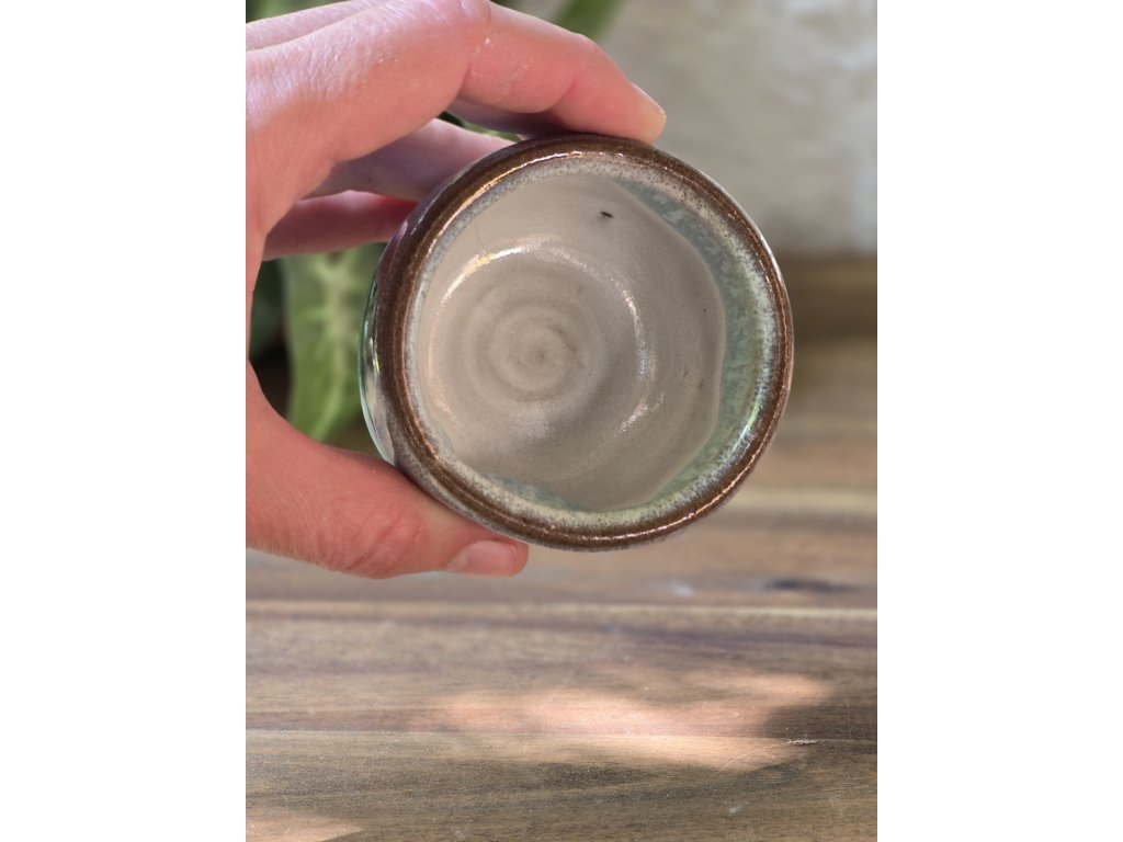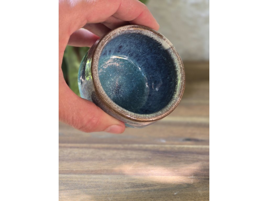 Presso šálek SeaFoam s důlkem na palec. 80 ml silnostěnné kameniny, tyrkysovo-bílé přelivy na tmavé hlíně.