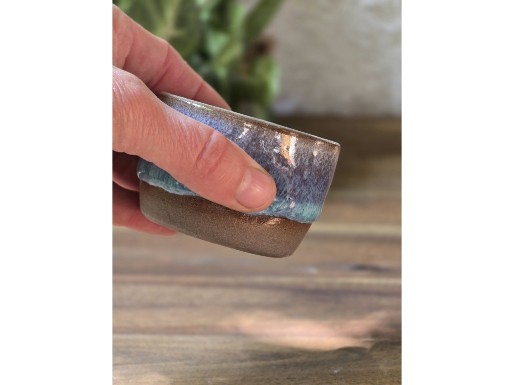 Silnostěnný hrneček o objemu 80 ml, ručně vytočený na kruhu z tmavé kameniny a vypálený na 1280 °C. Tyrkysovo-bílé přelivy na tmavém podkladu připomínají mořskou pěnu na písku. Každý kus je originál.