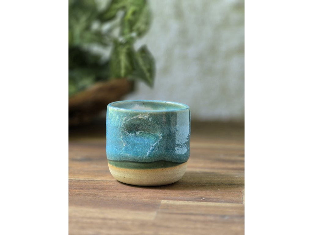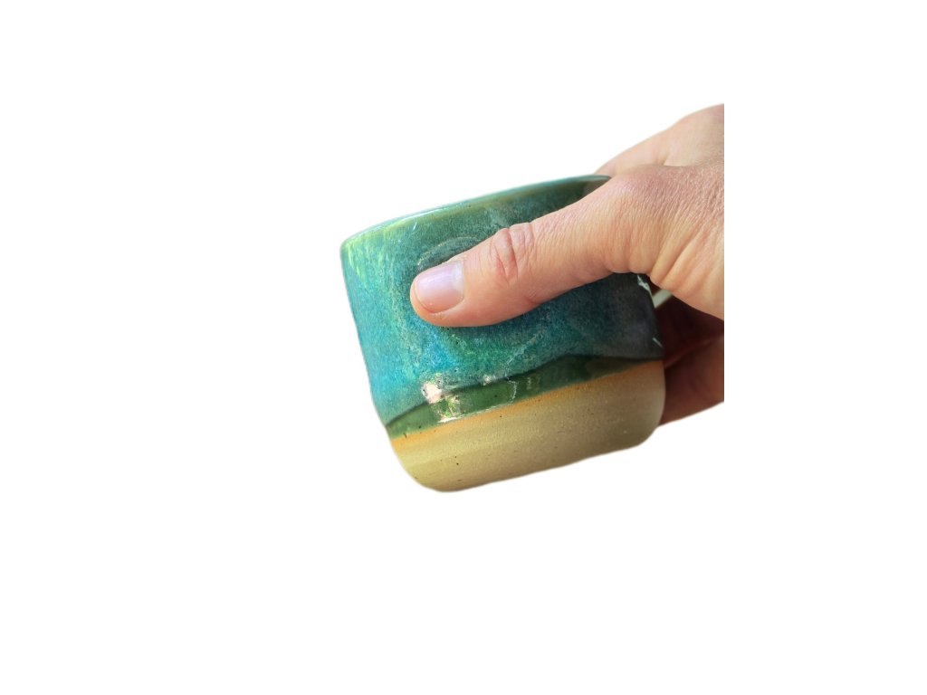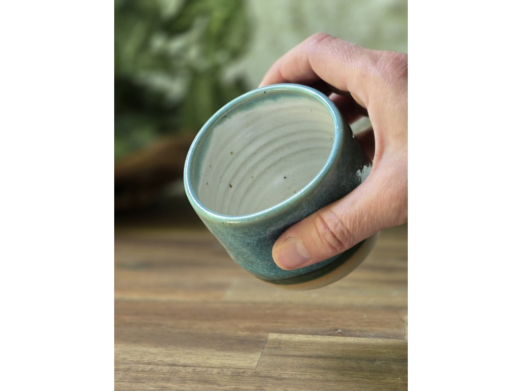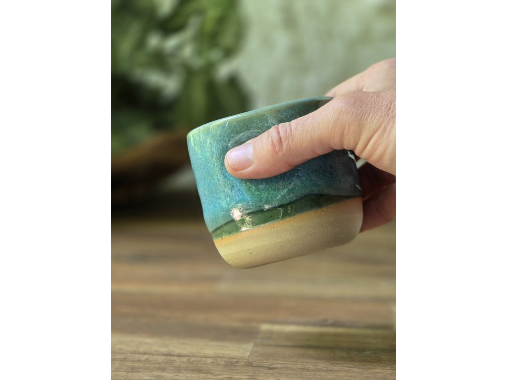 Yunomi kalíšek Emerald Lagoon vznikl jako experiment – a stal se jedním z nejhezčích překvapení. Kombinace dvou glazur, které už znáte z jiných kolekcí, vytvořila nový vizuální svět: modrozelený koberec tónů, které se jemně prolínají a reagují na světlo i tloušťku vrstvy.