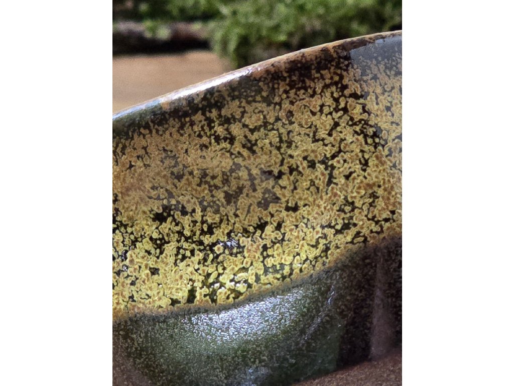 Vnější glazura Leopard je tmavě hnědá až černá, pokrytá jemnými zlatavými krystalky. Ty nejsou jen vidět, ale i lehce cítit pod prsty – každý kus je díky reaktivnímu výpalu jedinečný.